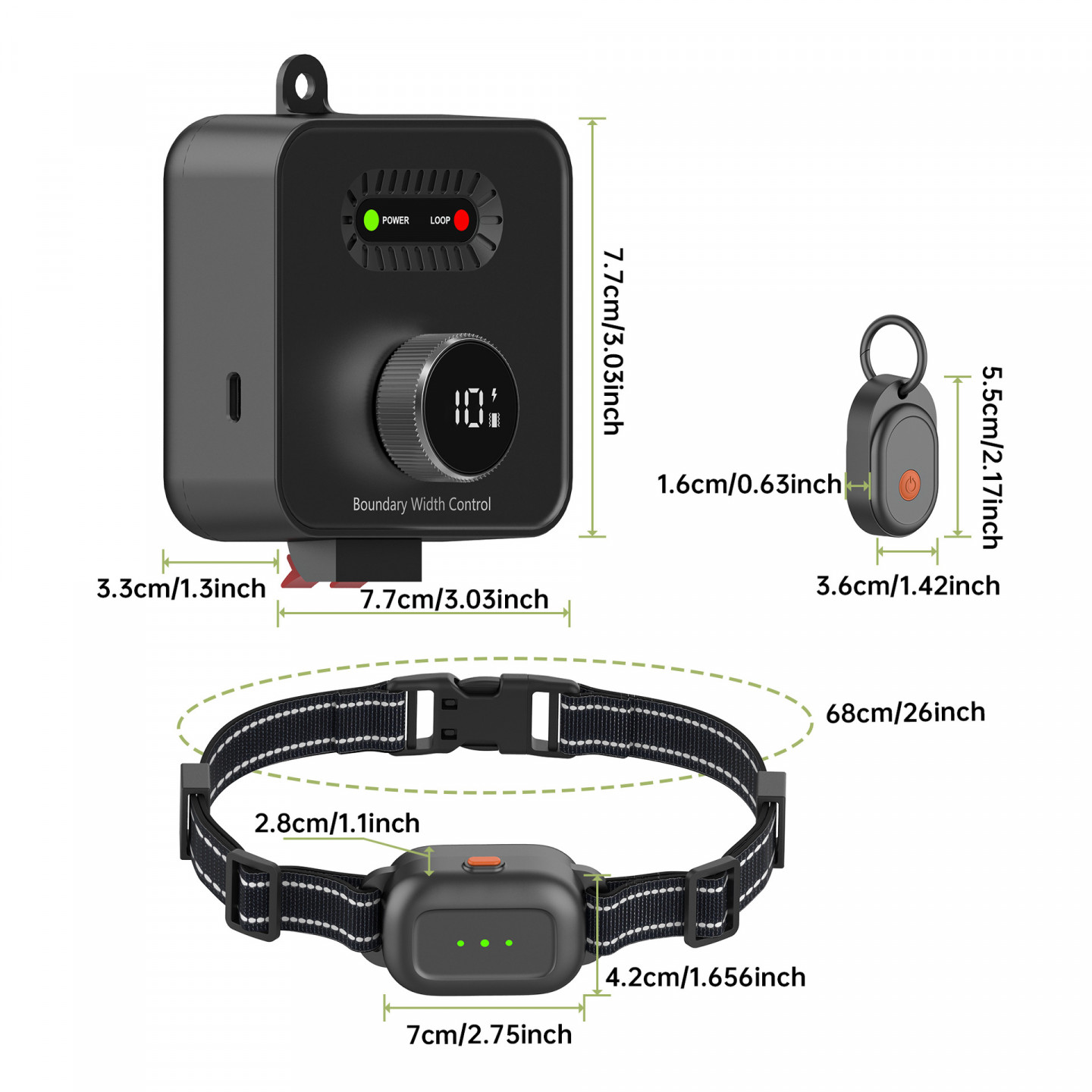 Ohradník umožňuje presné nastavenie šírky výstražnej a korekčnej zóny pomocou otočného gombíka na stanici – v 10 úrovniach. Pre signalizáciu poruchy, ako je napríklad prerušený drôt, je stanica vybavená svetelnou a zvukovou indikáciou. V balení nájdete dva typy prijímačov – prijímač s korekciou zvuk + vibrácia/statický impulz pre stredných a väčších psov alebo menej citlivé jedince a prívesok iba so zvukovým varovaním pre menších alebo dobre vycvičených psov. Zvukové upozornenie sa automaticky postupne zvyšuje – rýchlosť pípania rastie od úrovne 1 do 3. Oba prijímače sú dobíjacie a pohodlne sedia na krku psa vďaka ergonomickému dizajnu a pružnej pracke.